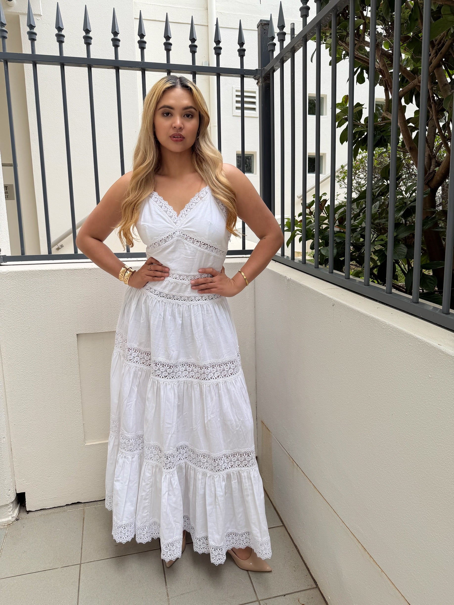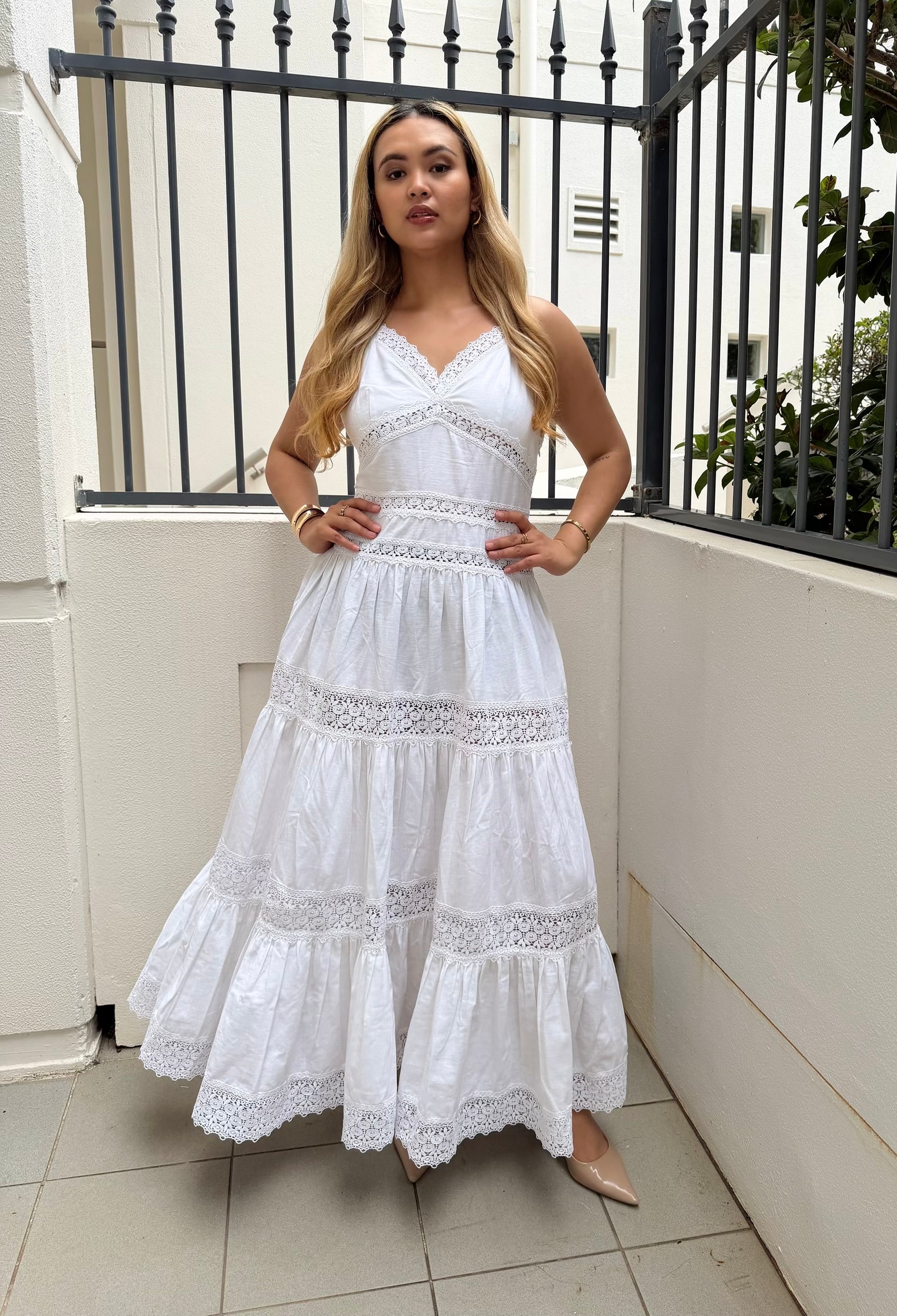 A vision of effortless elegance, this light blue maxi dress is crafted in a soft, breathable fabric that moves with grace. The sleeveless silhouette features delicate lace detailing at the waist, hem, and in horizontal bands across the tiered skirt, adding texture and romantic charm. Its tiered construction creates gentle volume and flow, ideal for both sunlit strolls and elevated occasions.