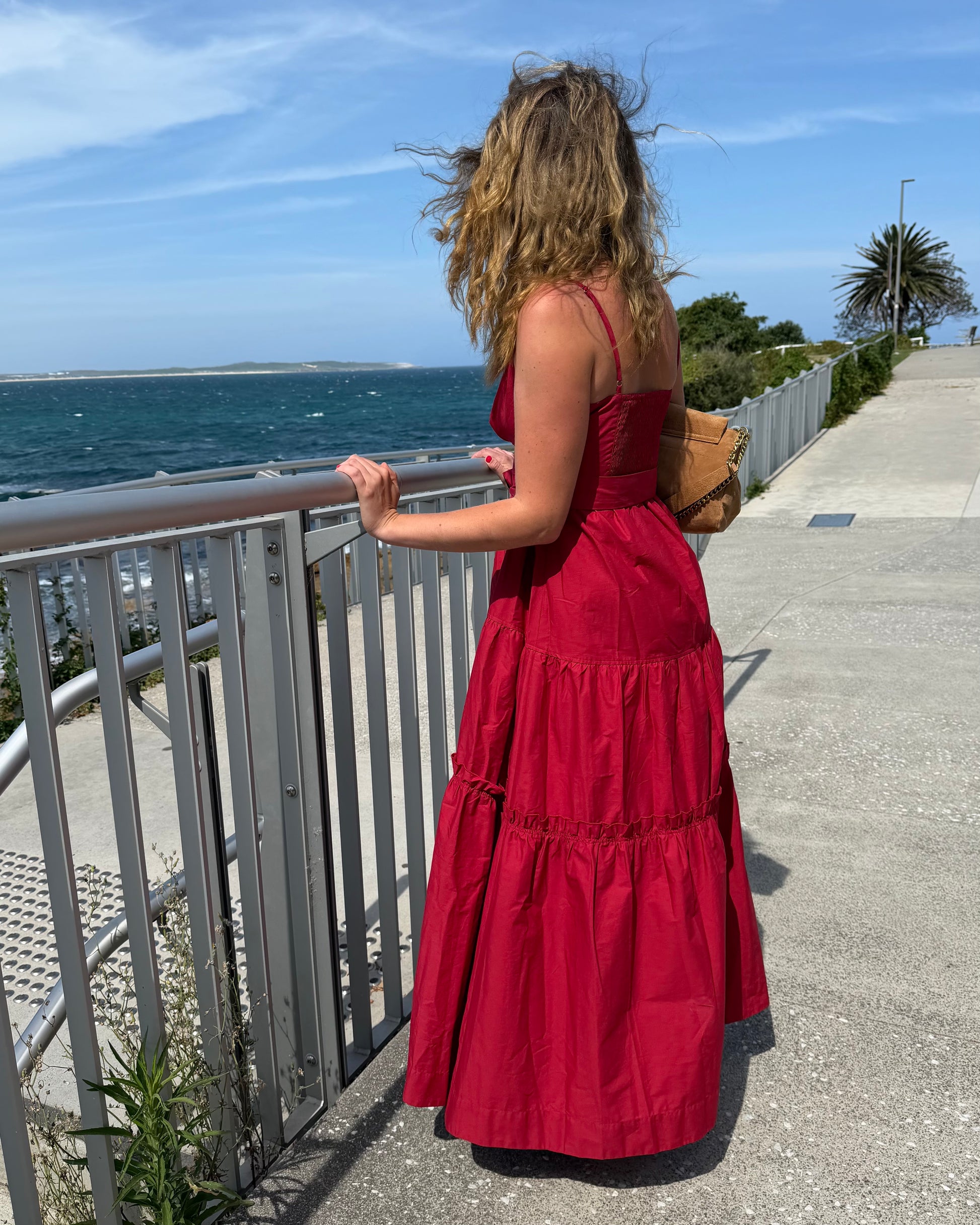 Commanding attention with every step, this red dress is a celebration of bold femininity and timeless glamour. Crafted from a fluid, lightweight fabric, it features: